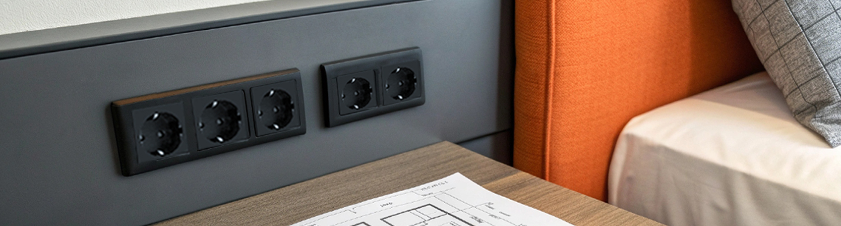 В спальне рекомендуется устанавливать по два гнездовых разъема с каждой стороны кровати для подключения настольных ламп и гаджетов. Это обеспечит комфорт и удобство в использовании.Розетки в рабочем кабинете