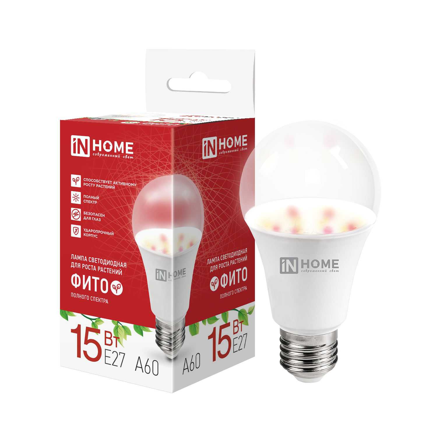 Лампа светодиодная LED-A60 PRO-ФИТО полный спектр 15Вт 230В Е27 IN HOME