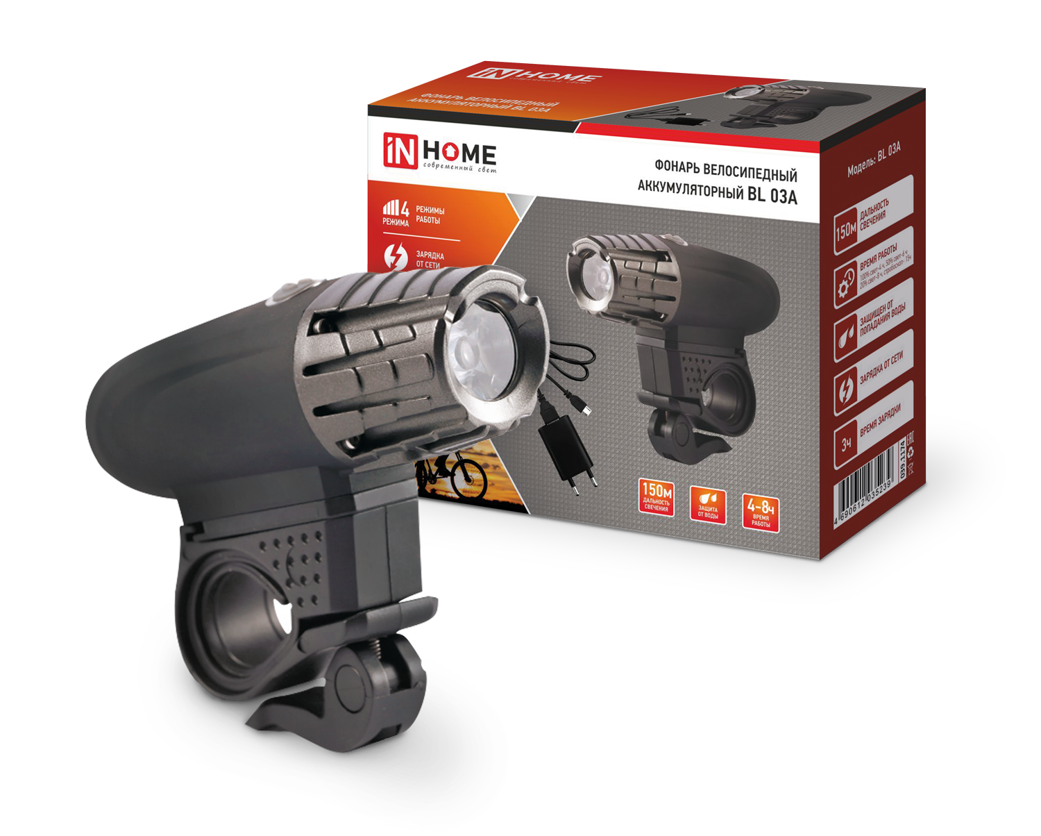 Фонарь велосипедный аккумуляторный BL 03А 3W LED 300Lm 4 режима с з/у 220В ЧЕРНЫЙ IN HOME