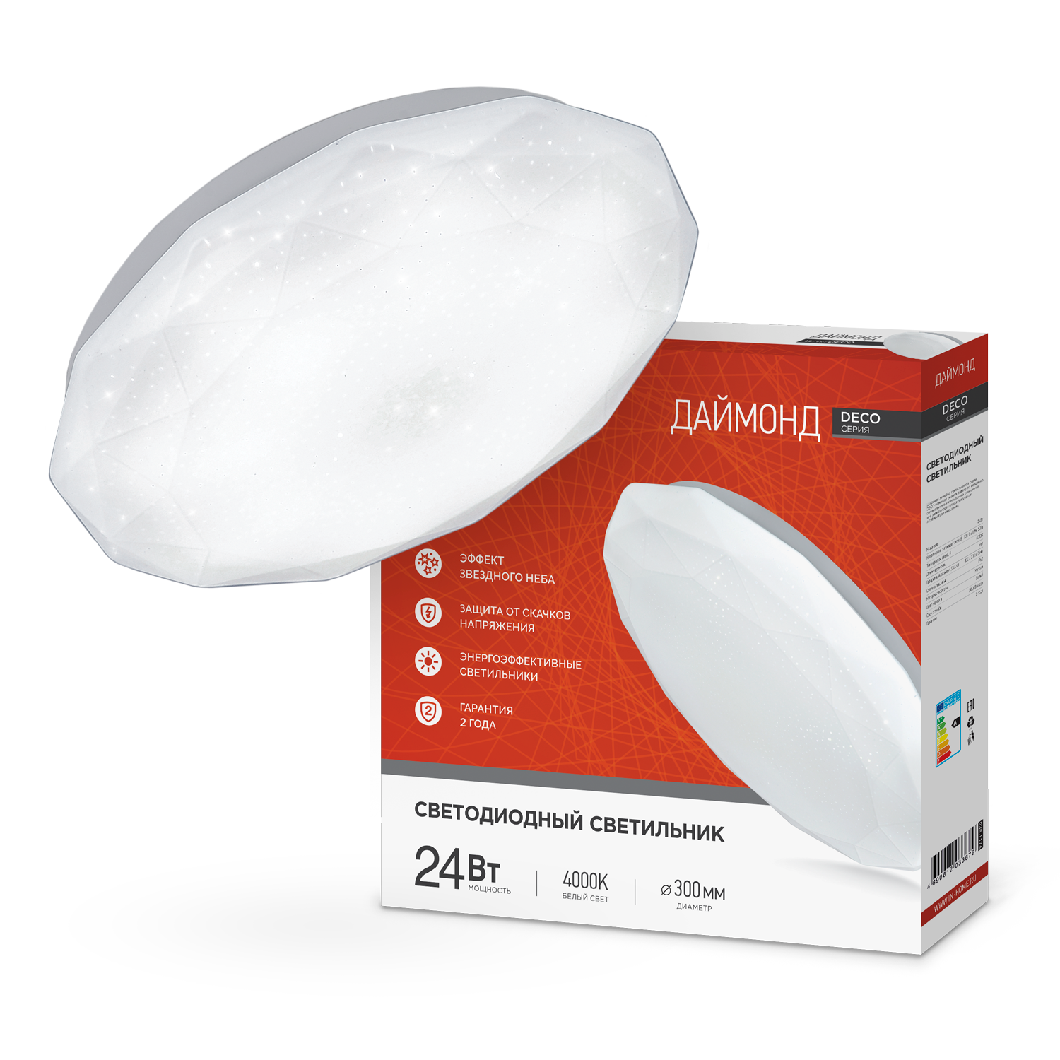 Светодиодный накладной светильник потолочно-настенного типа ДАЙМОНД серии DECO INhome выполнен в оригинальной форме ограненного бриллианта. Линейка светильников ДАЙМОНД представлена в трех размерах от 190 до 350 мм в диаметре. Несколько вариаций мощности (в диапазоне от 12 Вт до 36 Вт) позволяют подобрать оптимальный осветительный прибор в зависимости от конфигурации и габаритов помещения.