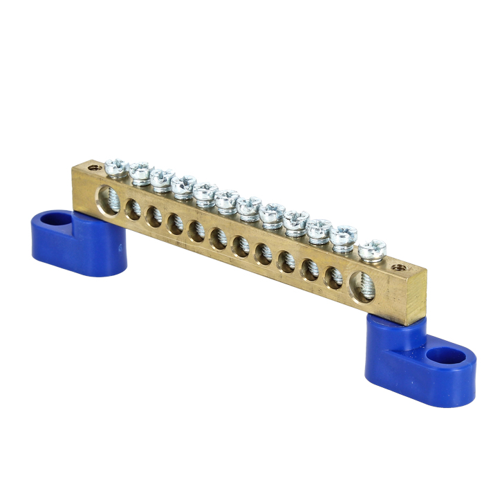 Шина "0" N (8х12мм) 12 отверстий латунь 2 синих угловых изолятора EKF PROxima
