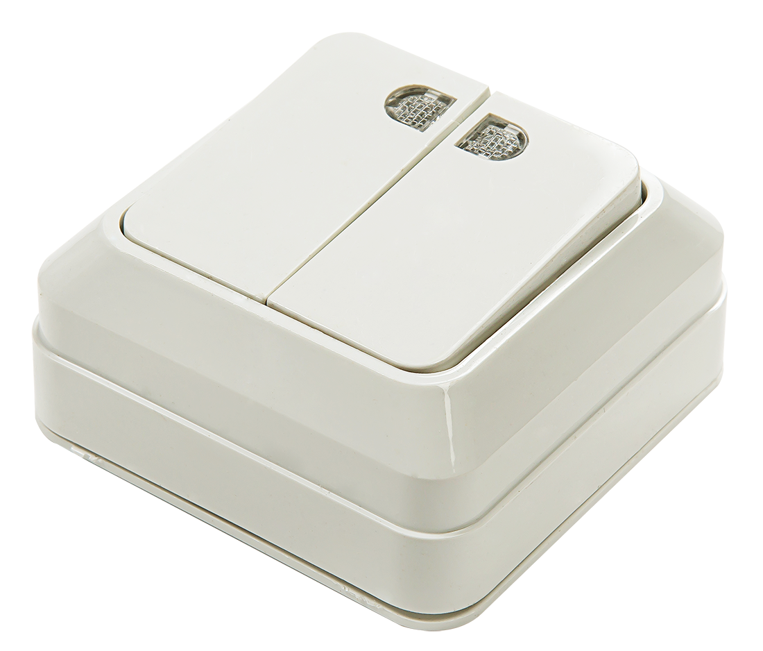 Выключатель двухклавишный с подсветкой BOLLETO белый накладной 7123 IN HOME